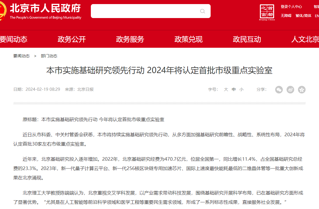 記者近日從市科委、中關(guān)村管委會(huì)獲悉,本市將持續(xù)實(shí)施基礎(chǔ)研究領(lǐng)先行動(dòng),從多方面加強(qiáng)基礎(chǔ)研究前瞻性、戰(zhàn)略性、系統(tǒng)性布局,今年將認(rèn)定首批30家左右市級(jí)重點(diǎn)實(shí)驗(yàn)室。 近年來(lái),北京基礎(chǔ)研究投入逐年增加。2022年,北京基礎(chǔ)研究經(jīng)費(fèi)為470....